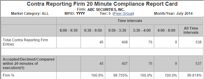 The Contra Reporting Firm 20 Minute Compliance Report Card is a monthly status report on compliance for market participants with the requirement that Contra Firms accept / decline / compare trades within 20 minutes of trade execution. It provides information about the number of trades that were accepted / declined / compared within 20 minutes of execution, along with the number of trades that were accepted / declined / compared greater than 20 minutes after execution time, as well as the percentage of those trades to total trades executed.
