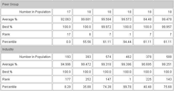 | Percentile | This is the selected MP's percentile (PERC), relative to other MPs in the industry, for its percentage of compliant entries that were accepted / declined / compared for the selected month and year in the given time interval. This percentile is calculated by sorting or ranking the firms based on percentage of compliant entries that were accepted / declined / compared. Once the firms are ranked, the rank of the firm relative to the (RANK) can be determined, and the percentile (PERC) can be determined by dividing the firm's rank by the total number of firms being ranked. (PERC = ((Number of firms in industry - RANK of firm) / Number of firms in industry) x 100) |