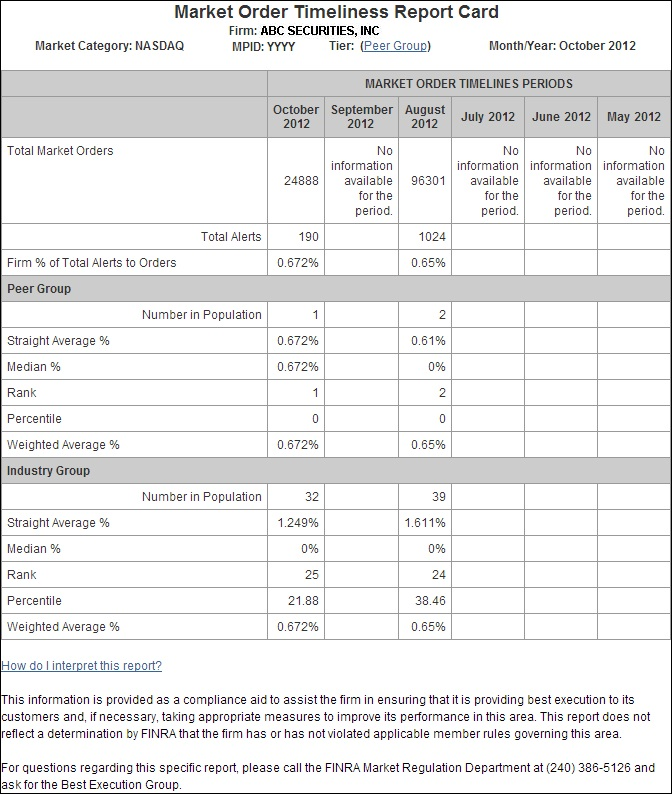 Please note: the Market Order Timeliness Report Card was modified in 2013. The documentation below defines the new version of the this report. Documentation for the prior version of the Report Card can be obtained by contacting Report Center or Market Regulation staff.