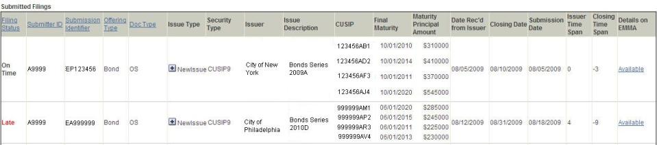 | Issuer Time Span | This is the number of business days between the date your firm indicated it received the document from the issuer and the date your firm submitted the document to EMMA. Per MSRB Rule G-32, Official Statements, Remarketing Supplements, Municipal Fund Security Disclosure Documents and Supplements, and amendments should be received within 1 day of receipt of the document from the issuer; therefore if this value is greater than 1 for any of those document types, the document will have a Filing Status of Late. |