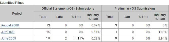 | Industry % Late | For each category listed above except for Cancellations, this is the percentage of late filings of that type submitted to total filings of that type submitted by all firms to EMMA during the report period. |