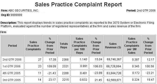 The Sales Practice Complaint Report is a quarterly report that displays trends in complaints with Sales Practice problem codes as reported to FINRA pursuant to FINRA Rule 4530. Note: prior to July 1, 2011, this report showed complaints reported pursuant to NASD Rule 3070(c) or NYSE Rule 351(d). For the purposes of the report, Sales Practice Complaints are evaluated against the number of representatives registered with the firm and the sales revenue of the firm. The complaint counts in this report are different than the counts provided in the Customer Complaint Report because the Sales Practice Complaint Report evaluates only complaints with sales practice problem codes. The problems considered to be sales practice problems are available on FINRA's website; a link to that information is provided below.