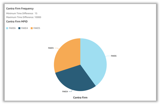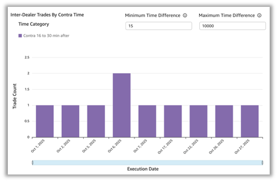 The Minimum Time Difference and Maximum Time Difference fields reflect the time difference in minutes between the contra party’s reported execution time and the member’s later reported execution time on the opposite side of the trade. These fields drive the two inter-dealer trade visualizations, one that displays the count of daily instances that meet the parameters and a second that displays the contra parties included in trades that meet the parameters. Based on member feedback, users can change the Minimum and Maximum Time Difference fields to broaden the inter-dealer trades included (e.g., including instances where the member’s execution time was prior to the contra party’s execution time by more than 15 minutes) or narrow the analysis to specific time difference slices (e.g., including instances where the member’s execution times were between 15 and 20 minutes after the contra parties’ execution times).
