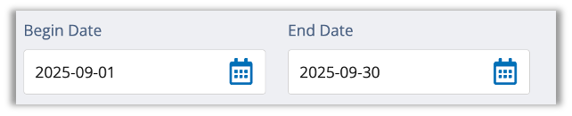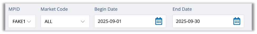To the right of the MPID and Trading Market Code dropdown selectors in the Control Panel, the Interactive Report Card presents members with a selectable Begin Date and End Date. The default Begin Date is the first day of the previous full month and the Default End Date is the current date. For example, a member accessing the Interactive Report Card on Tuesday, October 14, 2025, would see a default Begin Date of September 1, 2025, and a default End Date of October 14, 2025. Members can adjust the date range to span across longer or shorter custom date ranges; this Interactive Report Card has data available back to January 1, 2025. The Begin and End Date dynamically drive the contents of interactive visualizations in the remainder of the Interactive Report Card