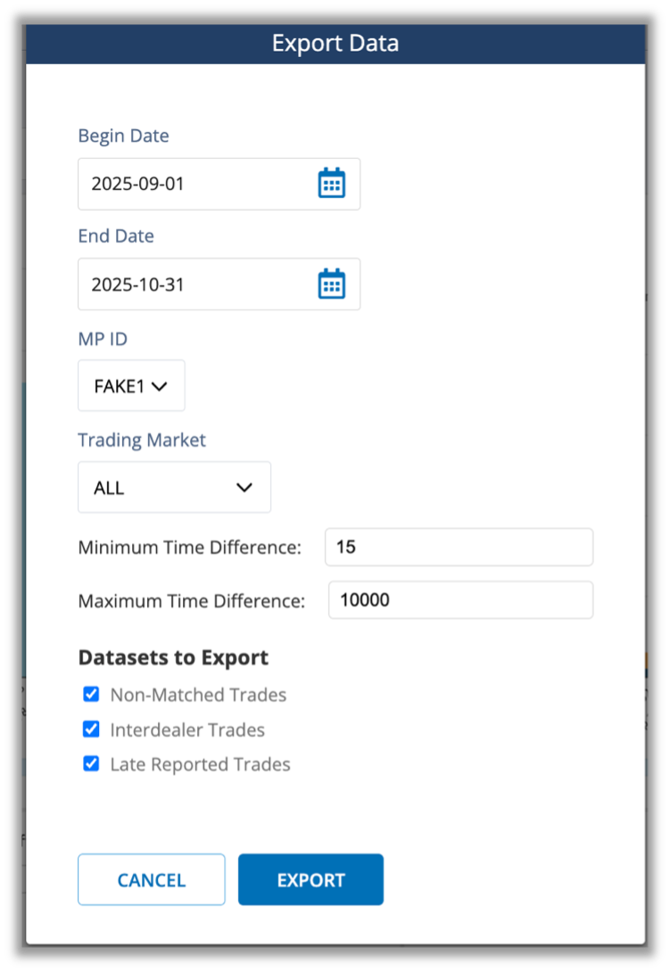 The download is a .zip folder that contains Comma Separated Value (CSV) files a “manifest” file that describes the details of the export (e.g., Begin Date, End Date, MPID, Trading Market Code); and files that correspond to the datasets you have selected to export (i.e., Non-Matched Trades, Inter-dealer Trades, Late Reported Trades). Please find the file layouts for these data sets [file layouts].
