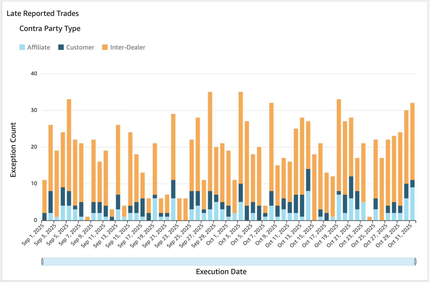 The top right visualization under the Control Panel displays the daily count of transactions that a member executed but reported greater than the allowable time after the time of execution (Late Reported Trades). Only valid trade reports are considered. The visualization also identifies the Contra Party Type: Affiliate; Customer; Inter-dealer.