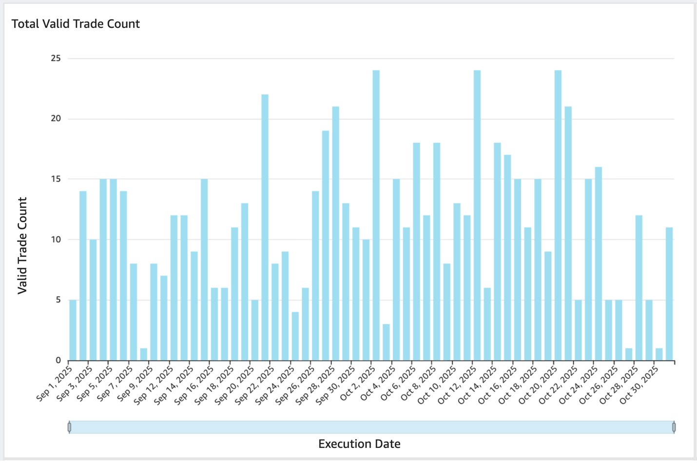 The top left visualization under the Control Panel displays the daily total valid trade count for the period selected. In this context, a valid trade is one reported and not cancelled at trade date plus three business days (T+3). Each trade is only represented once in this count; if a trade is submitted during the report month and then corrected once or more during T+3 period, that trade is still only counted once in the Total Valid Trade Counts.
