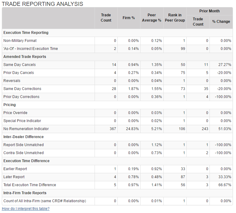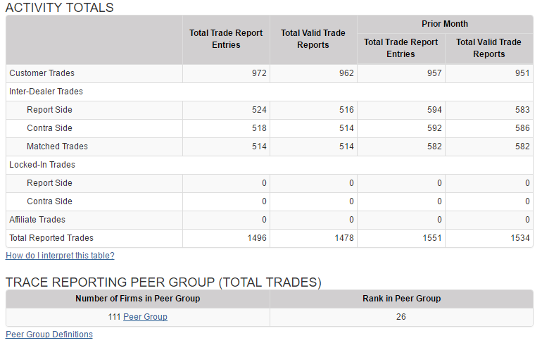 | Rank in Peer Group | This is the rank of the selected market participant (MP) relative to other MPs in its peer group. In this section of the report, the rank is based solely on number of trade reports submitted by the firm during the month. This rank does not indicate whether or not the firm's reporting was timely or accurate. MPs with a greater number of trade reports in a given month will have a higher rank. The firm with the greatest number of trade reports in a given month in the peer group will be ranked number 1. |
