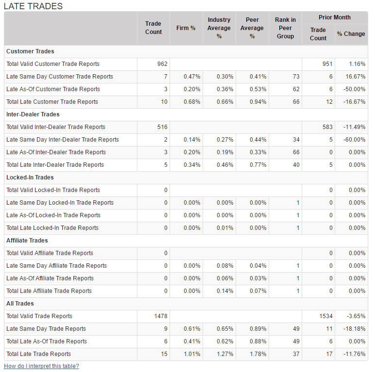 | Rank in Peer Group | For each value provided in the late trades table, the rank is based on the percentage of total alerts of that type listed to total valid trade reports for the selected view, month and year. Firms are ranked in ascending order from the lowest percentage of alerts to total valid trade reports to the highest percentage of alerts. |
