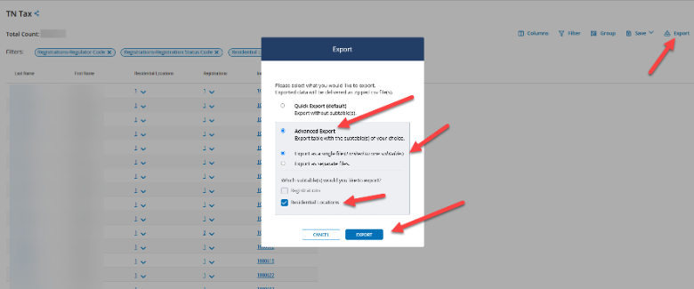 Click on the Export icon in the upper righthand section of the report. Then in the Export dialog box that opens up, select Advanced Export, Export as a Single File, and Residential Locations sub-table by clicking on the radio buttons or checkboxes that apply to them.