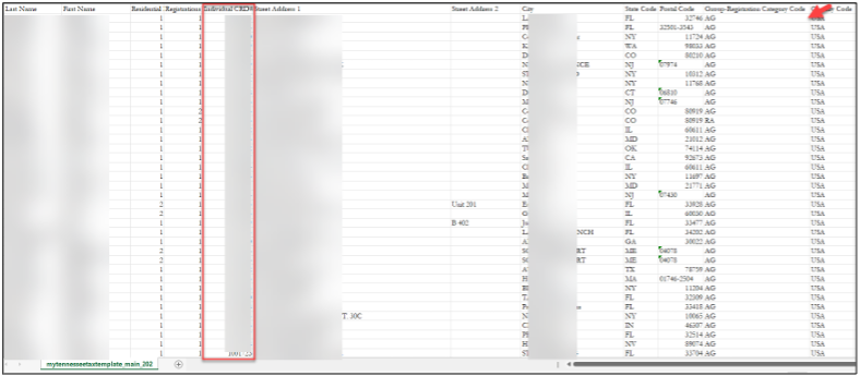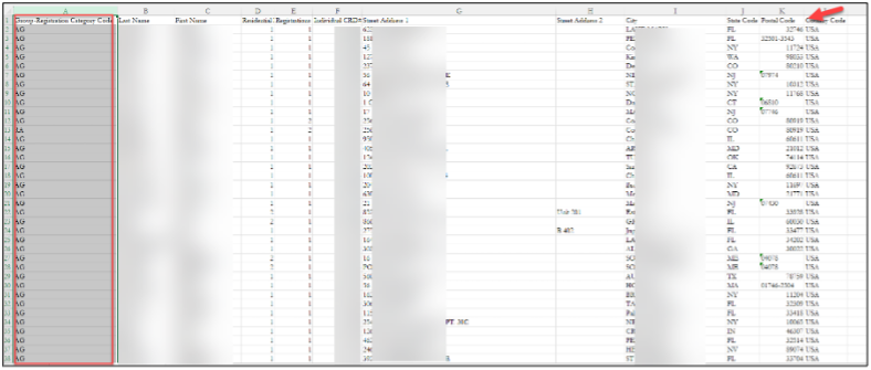 Select the Group-Registrations Category Code column, CUT it, and then INSERT it in between the Postal Code and Country Code columns.