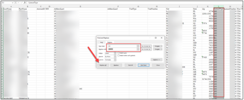 Select the LicenseType column, select the Find and Replace tool in Excel and replace all AG with AGNTL and then replace all RA with INADL.