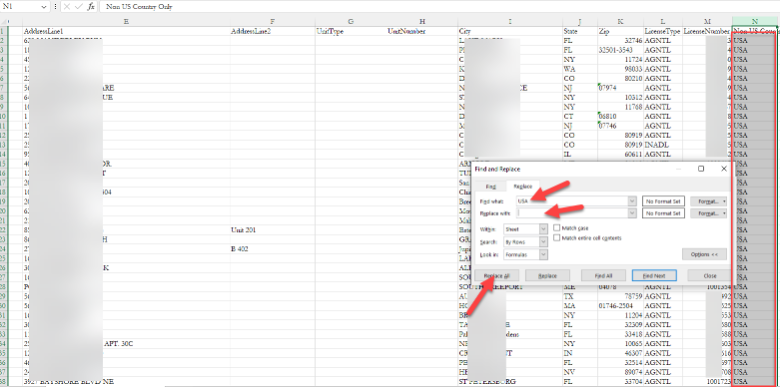 Now to only report Non US Countries, select all the data in the Non US Country Only field, open the Excel Find and Replace tool and replace USA with a blank.