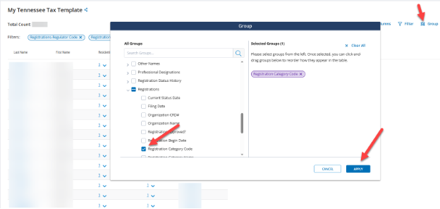 In the Group dialog box, navigate to the Registration Category Code field under the Registration group and check the box next to it.