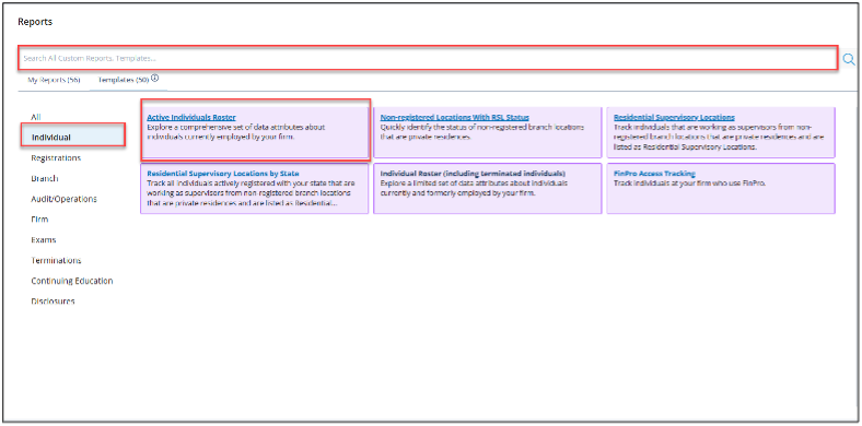 Create a Tennessee Tax Template for your firm by logging in to FINRA Gateway, clicking on the Reports tab, and selecting the Active Individuals Roster. You can find the Active Individuals Roster by using the search bar or browsing to Templates and choosing the Individual category.