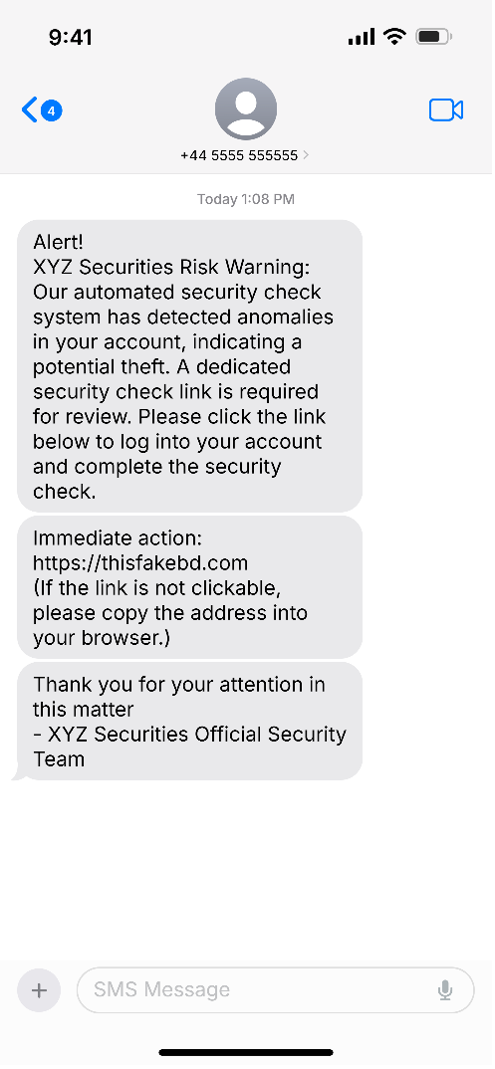 “Your account shows suspicious activity that might indicate potential theft. Please click the link below to check your account.” Have you, or has someone you know, received a text message like this that appears to be from a brokerage firm? Though the urgent nature of these messages might make it seem that you should take immediate action, don’t engage—chances are they’re fraudulent.