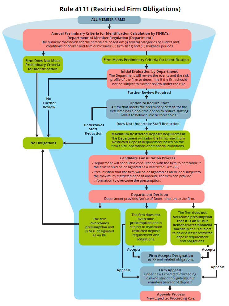 Rule 4111 allows FINRA to impose new obligations on broker-dealers with significantly higher levels of risk-related disclosures than other similarly sized peers, based on numeric, threshold-based criteria. It establishes a multi-step, annual process through which FINRA will determine whether a member firm raises investor protection concerns substantial enough to require that it be designated (or re-designated) as a “Restricted Firm” and subject to additional obligations.
