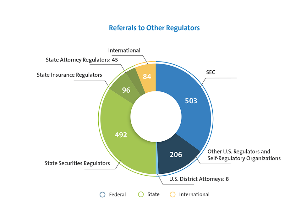 In certain situations where Helpline staff identify potential legal and regulatory violations during discussions with customers that fall outside FINRA’s jurisdiction, they also refer matters to other federal, state and local regulators for investigation and potential action.