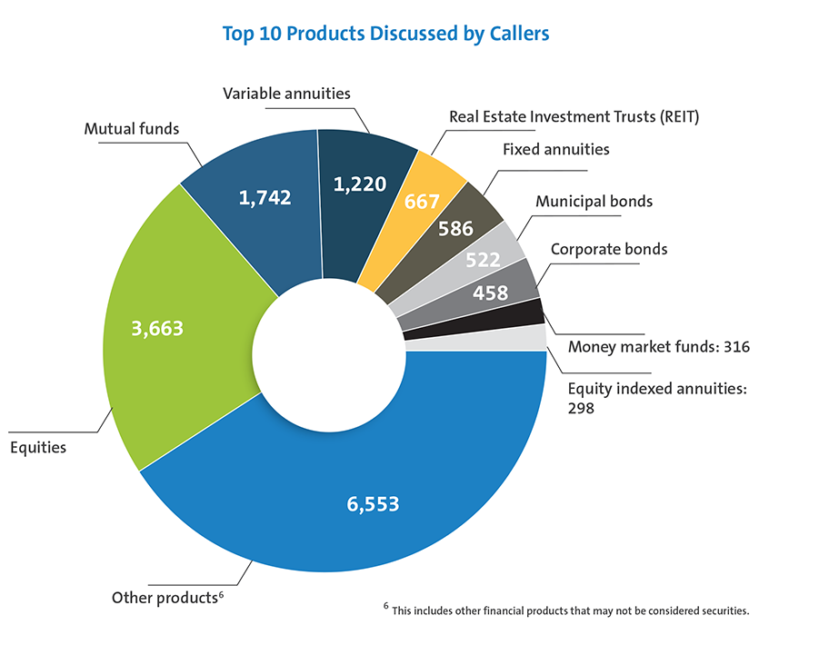 Senior investors, their family members or their registered representatives reach out to the Helpline to request support regarding a broad range of issues. Some callers request guidance with accessing background information about their registered representatives in BrokerCheck, whereas others raise concerns about other possible misconduct, such as fraud, financial exploitation or sales practice activity.