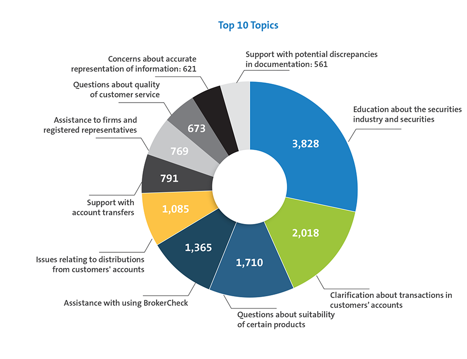 The Helpline staff answer questions and provide assistance on wide-ranging topics across the securities industry and escalate issues within FINRA or to other regulators—such as the SEC, state regulators, APS or international regulators—when there is potential evidence of misconduct. Helpline staff receive specialized training to prepare them to respond to and, where possible, resolve callers’ questions, which may include contacting firms to resolve problems or clarify questions, obtaining restitution for customers, performing additional research, and connecting callers with FINRA and other resources. In addition, Helpline staff collaborate with the FINRA Foundation on outreach and communications to investors.