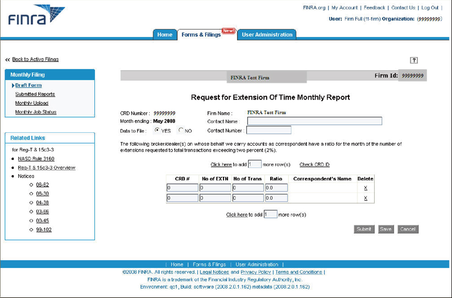 FINRA has integrated the legacy NYSE Regulation and NASD extension of time processing systems into one combined system. Effective November 17, 2008, all requests for an extension of time must be filed through the new system, known as the "Reg T" system, which is accessible through FINRA's Firm Gateway.